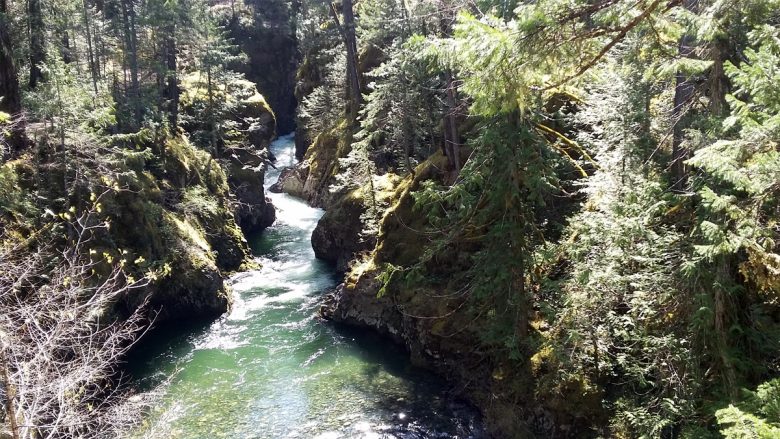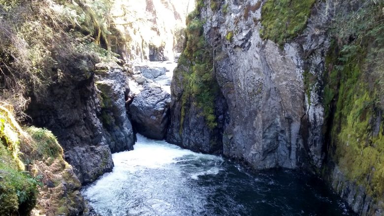 Trail access is across the highway from Commbs Country Candy Store (bonus!) just before Port Alberni (coming from the East). I could smell the sugar from the parking lot. This is a short, pretty walk and hard to believe you’re just 10 min away from the highway. The “hole in the wall” was blasted through …