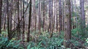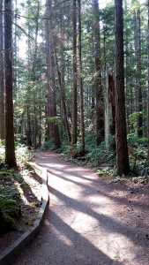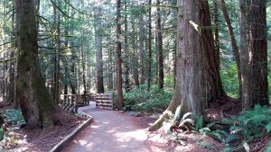 The South Loop trail begins at the parking lot next to the Lighthouse Community Centre in Qualicum Bay. Signs from the Island Hwy will direct you there. The trail is flat, wide and completely wheelchair accessible with some informational signage along the way. Enjoy the Coastal Douglas fir forest as the trail takes you over bogs, streams and creeks. There are a number of benches along the way to relax and enjoy nature. Everything was dried up during my visit today, yet the forest still looks lush and green. At the end of the trail, walkers and bikers can loop back through adjacent community woodlot trails and Crown Forest which is not wheelchair accessible.